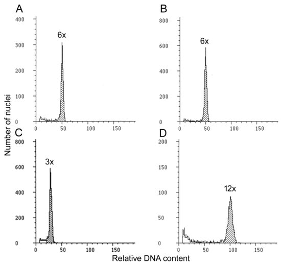 Histograms obtained in the FCM analysis in chrysanthemum ‘Jewel Time Yellow’: in vivo-grown mother plant (A); plant regenerated in vitro from an ovary with a ploidy level consistent with the control (2n = 6x) (B); haploid plant regenerated in vitro from an ovary on the medium with 1.0 mg·L−1 TDZ (2n = 3x) (C); plant regenerated in vitro from an ovary treated with high temperature with a doubled ploidy level (2n = 12x) (D).