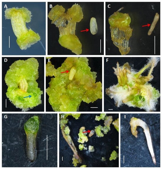 Callogenesis and somatic embryogenesis in ovaries of chrysanthemum ‘Capitola’ cultured in vitro on the MS medium supplemented with 1.0 mg·L−1 2.4 D and 1.0 mg·L−1 BAP: week 1–callus regeneration on the proximal and distal end of an ovary (A), week 1–intact ovule isolated from an ovary (B); week 2–shrink, damaged ovule dissected from an ovary (C); week 3–ovary overgrown with vivid greenish callus, blue arrow indicates SE at globular stage (D); week 4–intact ovule surrounded by callus regenerated from an ovary wall (E); week 5–the ovary covered with callus from which numerous somatic embryos with hairy roots develop (F); week 5–somatic embryo isolated from callus (G); week 6–intact ovule dissected from callus originating from an ovary wall (H); week 6–mature somatic embryo dissected from callus originating from an ovary wall (I). Bar = 1 mm; red arrows indicate ovules.