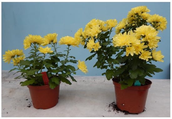 Chrysanthemum ‘Jewel Time Yellow’: true-to-type, hexaploid (2n = 6x) reference plant (left) and dodecaploid (2n = 12x) plant regenerated from heat-treated ovary (right).