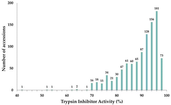 In this study, TIA analysis was conducted on a large number of soybean accessions using a colorimetric enzyme assay that relies on enzyme–substrate reactions []. However, enzyme–substrate reactions are significantly influenced by temperature and incubation time. Lowering the temperature of the reagent or reducing the reaction time may lower the TIA content. In this experiment, to maintain a consistent temperature, the assay buffer was pre-stored in a dry bath at 40 °C to create the BAPA working solution. Additionally, the protein extract was refrigerated at 2 °C. As the temperature of the protein extract approached room temperature, lower values were observed in soybean varieties with low KTI content. However, there was no significant reduction in varieties with high KTI content. This suggests that the modified assay in this study effectively screens for KTi and allows for the accurate and rapid screening of low TIA levels.