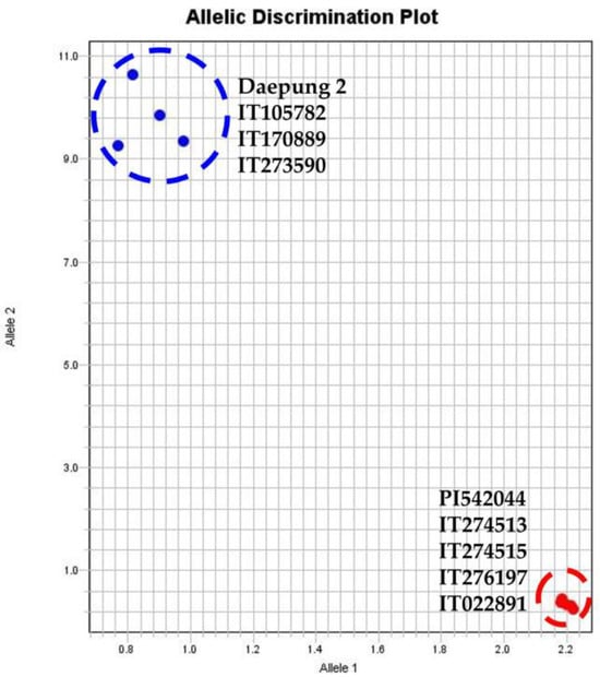 KASP assay for KTi-1 using HEX and FAM fluorescent fluorophores. Shown in red are the soybean lines with KTi-1 mutation concentration accumulation, indicated by HEX fluorescence, and in blue are the differences from KTi-1 cultivars, indicated by FAM fluorescence.