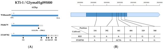 Re-sequencing analysis is the most effective method for identifying genetic variations in candidate genes. Jofuku and Goldberg reported a minimum of 10 KTi genes in the soybean genome. []. In this study, KTi genes were identified from the Williams82 soybean reference genome (Wm82.a2.v1.genome). Using re-sequencing analysis, we examined the genetic variations of the gene in three soybean accessions (IT105782, IT170889, and IT273590) containing no KTi-3 gene mutation. Remarkably, we found that IT105782 contained a three-base-insertion mutation (A461 → ACTA) and five missense mutations in the coding region of the KTi-1 gene (Glyma.01g09500) (Figure 3). The insertion of an additional three-base pairs led to the insertion of one more amino acid (Y154 → YY154), without resulting in a frameshift change. The previously reported KTi-1 null line, PI68679, had a single-base deletion (GGG → 358GG) at position 356 bp, resulting in a frame shift and a truncated protein []. Therefore, the mutation found in IT105782 differed from PI69679, suggesting that it is a new mutant allele of the KTi-1 gene.