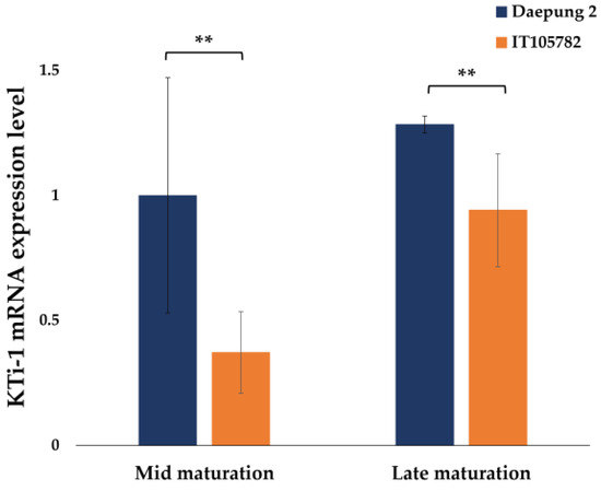 To evaluate the role of the KTi-1 gene in soybean seeds, we analyzed its expression levels at two different stages of seed development and compared them to both IT105782 and the wild type genotype. The analysis revealed a significant decrease in the expression of the KTi-1 gene in IT105782 (a KTi-1 mutant) during both the mid- and late stages (Figure 4). In the mid-stage, IT105782 showed a significant decrease of 63% compared to Daepung 2. Additionally, a significant decrease of 17% was observed in the late stage compared to Daepung 2.
