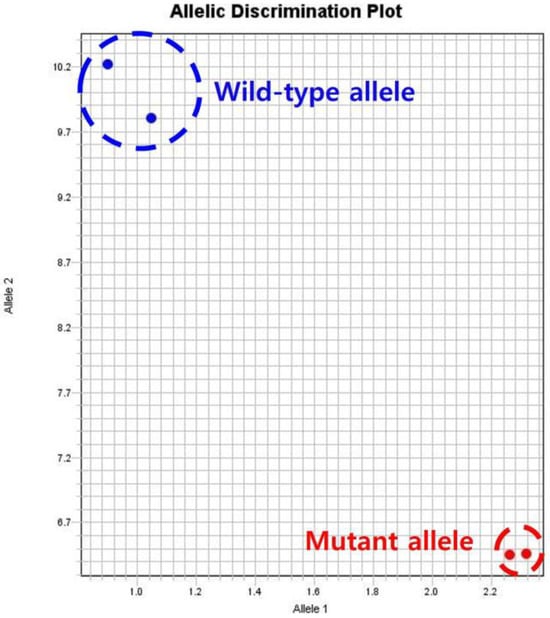 To evaluate the impact of the novel KTi-1 gene mutation on mRNA levels, we conducted RT-qPCR analysis on mature seeds. The results showed a significant reduction (17–63%) in the expression level of the KTi-1 gene in IT105782 compared to the wild type Daepung 2 during the mid-maturation and late-maturation stages (Figure 4). This reduction suggests a direct correlation between the reduced KTi-1 mRNA level and the decline in TI protein production. Moreover, it is crucial to consider the suitability of these three soybean varieties for cultivation. An assessment of various agricultural characteristics, including average seed weight, seed count, and other quantitative aspects, indicated that these varieties may not be ideal choices for cultivation. In the development of genetic markers related to KTi-1, some efforts have faced challenges and been unsuccessful []. Despite these challenges, we successfully developed the KTi-1 KASP marker, demonstrating its effectiveness in distinguishing between the mutation type and the wild type.