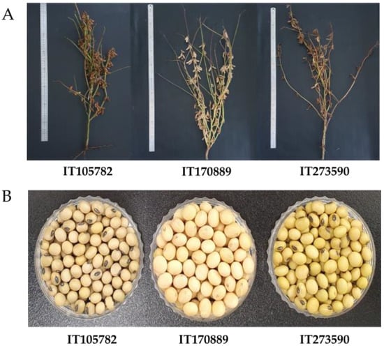 The agricultural characteristics of four soybean accessions harvested in 2021, namely, IT105782, IT170889, IT273590, and Daepung 2, were evaluated. As shown in Figure 6 and Table 5, the three soybean accessions (IT105782, IT170889, and IT273590) exhibited higher plant height compared to Daepung 2, accompanied by more pods and branches. Daepung 2 showed a flowering date that was 10.6 days earlier than the average of the three accessions. IT105782 showed the quickest maturation, while IT273590 exhibited the slowest. The average 100-seed weight (16.9 g) of the three soybean accessions was half that of Daepung 2 (30.88 g), and the seed numbers per pod were lower than that of Daepung 2. In general, the agronomic traits of the three soybean accessions were deemed unsuitable for use as soybean cultivars.