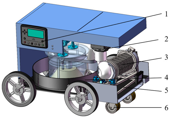 Three-dimensional model diagram of straw cover weight detection machine. 1. Control unit; 2. Straw suction unit; 3. Straw cleaning unit; 4. Straw cutting unit; 5. Weighing unit; 6. Walking unit.
