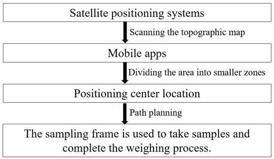 The straw cover weight detection machine mainly includes the following components: the mobility unit, straw cutting unit, straw suction unit, straw cleaning unit, weighing unit, and control unit, as shown in Figure 1. The control unit coordinates multiple units of the detection machine for real-time measurement of straw coverage in multiple areas. The mobility unit, using a satellite positioning system, scans the field map of the target area and transfers it to a mobile app. The machine’s built-in program then plans the optimal path to reach each specified measurement area, as illustrated in the process flow of the mobility unit in Figure 2. The straw cutting unit separates the straw inside and outside the sampling frame using cutting blades, with adjustable frame height. The straw suction unit utilizes a negative pressure pneumatic conveying system, along with air ducts and an axial-free screw conveyor, to transport the straw within the sampling frame to the double-layer straw sieving cylinder of the straw cleaning unit for the removal of impurities. The effectiveness of the air duct transportation system, especially in terms of cleaning surface straw within the target area, determines the quantity of straw transported to the straw cleaning unit. This quantity, in turn, determines the straw weight measured by the weighing unit. Therefore, the straw suction unit is a crucial component for ensuring accurate measurement results and represents the core focus of this study.