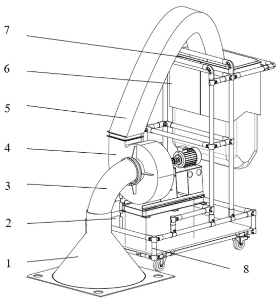 Straw suction unit bench structure. 1. Suction cavity; 2. Inverter; 3. Air intake duct; 4. Centrifugal fan; 5. Air outlet duct; 6. Collection bag; 7. Frame; 8. Chassis.