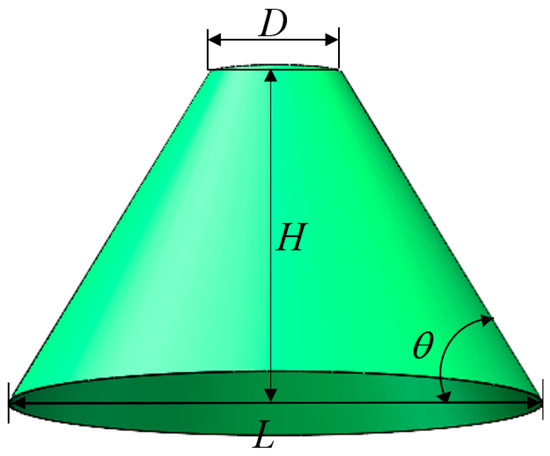In order to save power, facilitate subsequent processing of the suction chamber, and make the bottom area closer to an integer value for ease of calculation, the suction chamber’s bottom area was set at 0.5 m2, and the bottom diameter L was designed to be 800 mm. Since the suction chamber is connected to the air duct at the straw outlet, the diameter D of the straw outlet is determined based on the calculated results of the air duct’s inner diameter. The suction chamber’s height H is determined based on the height of the chassis of the straw cover weight detection machine and the selected fan’s outlet center height. The slope θ ranges from 0° to 90°. When calculating pressure loss, the maximum values of the suction chamber’s structure were used to meet the requirements for subsequent straw suction.