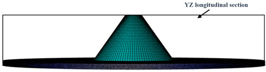 Because parameters at the inlet around the bottom of the suction chamber were unknown, and the airflow patterns were complex, an extended area was established. The height of the extension area had minimal impact on the results and was set to 50 mm, which was the same as the gap between the suction chamber and the ground. The radius was set to three times the suction inlet radius, which was 1200 mm. The mesh was generated using the meshing method provided by Workbench 2020 R2, utilizing unstructured meshing. Mesh quality was assessed using the skewness mesh metric, with a maximum value set at 0.85. The results indicate that the mesh quality was good, with more than 2 million mesh elements, as shown in Figure 7. Since the fan pressure affects the suction force, and thus the straw suction efficiency and airflow velocity distribution within the suction chamber, and considering that the fan pressure can be adjusted, the simulated outlet pressure parameters were set to −2500 Pa to −3500 Pa, based on the minimum calculated fan pressure when the outlet diameter was 200 mm, which was 2312.5 Pa. Because the pressure difference inside the suction chamber generates airflow for straw suction, the boundary condition for the chamber’s bottom was set as pressure inlet (0 Pa), and the straw outlet was set as pressure outlet with actual negative pressure values.