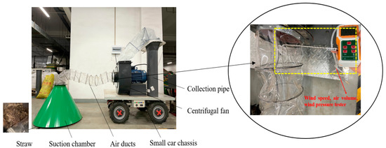The whole test bench, as depicted in Figure 8, consisted of a small car chassis (1300 mm × 1000 mm), polyurethane air ducts, a centrifugal fan from the 06-46 3.6A type, a collection pipe, and the suction chamber. A uniform sample of 1.3 kg of straw was spread on the ground with a diameter of 800 mm, and the suction chamber was placed 1 cm above the corresponding straw location. To measure the airflow velocity, air volume, and pressure within the suction chamber, the following steps were followed. First, the researchers waited until the fan speed stabilized. The wind speed, air volume, and pressure tester were then placed parallel to the ground at the bottom of the suction chamber. The measuring end of the tester was inserted 100 mm, 200 mm, and 300 mm from the edge of the suction chamber. Six testers were selected evenly spaced along the circumference and measured at 400 mm from the edge of the suction chamber, which was the center of the bottom of the suction chamber. Each measurement lasted approximately 15 s, or until the tester showed a stable number. The data for each point were recorded. There were 19 wind speed values per group of tests. To obtain the average velocity vj of airflow near the ground, the average value for each group of wind speed was calculated. To measure the average air flow speed vo at the stalk outlet, the wind speed, air volume, and pressure tester were inserted into the air duct at the outlet of the suction cavity. The measurement was made the same way as for the average air flow speed near the ground.