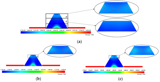 According to Figure 9, based on the overall distribution of negative pressure, the YZ cross-section of the suction chamber is divided into three regions, labeled p, q, and r, representing the upper, middle, and lower parts of the suction chamber, respectively. In the bottom part of the suction chamber (region r), where the expansion area was connected to the external atmosphere, the static pressure remained minimal and close to 0, as depicted in Figure 10, where the airflow velocity in the expansion area was also 0. As the airflow entered the connection point between the expansion area and the suction chamber, there was a sudden increase in negative pressure, leading to a rapid increase in airflow velocity, as shown in Figure 12, with the airflow velocity reaching its peak at the outermost periphery near the suction chamber entrance. As the airflow converged toward the center from the surrounding areas, collisions between airflow particles occurred, resulting in energy loss. This led to a decrease in negative pressure of approximately −1360 Pa in the central area near the ground, indicated by the green region in Figure 9. In this central region, the airflow experienced the greatest energy consumption, resulting in the lowest airflow velocity near the ground. In the middle region (region q) of the suction chamber, the negative pressure gradually decreased as it transitioned to the upper part of the suction chamber (region p). The negative pressure decreased from around −2500 Pa to approximately −2200 Pa, and this reduction became more pronounced as the suction chamber height increased. In the upper part of the suction chamber (region p), the negative pressure gradually decreased, forming a gradient, as observed in Figure 9. However, near the suction chamber’s exit where the negative pressure suddenly increased, there was a decrease in negative pressure as the airflow accelerated and converged toward the exit. This phenomenon was accompanied by an increase in airflow velocity. Near the exit, the airflow converged and resulted in higher airflow velocity values, as shown in Figure 11e,f.