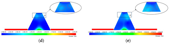Static pressure contour map of suction chamber YZ cross-section. (a) H = 550 mm; (b) H = 450 mm; (c) H = 500 mm; (d) H = 600 mm; (e) H = 650 mm.