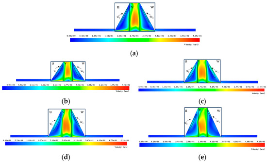 Velocity contour map of suction chamber YZ cross-section. (a) H = 550 mm; (b) H = 450 mm; (c) H = 500 mm; (d) H = 600 mm; (e) H = 650 mm.