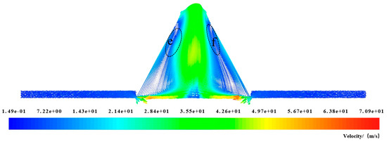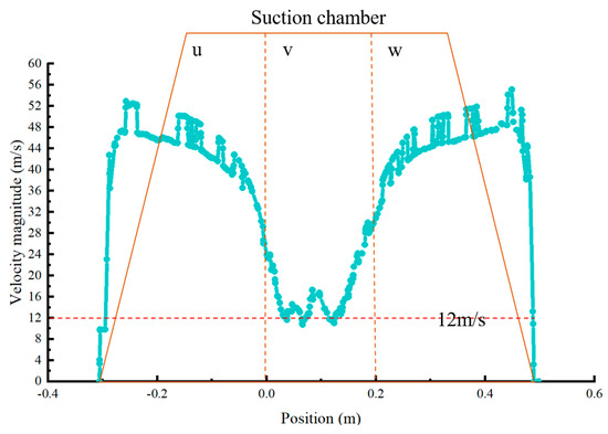 Figure 10 reveals that the airflow velocity in the vertical region of the suction chamber (v) has higher values compared to the side regions (u, w), forming a distinct boundary. A prominent feature was the red-colored high-speed airflow column, which can be approximated as a vertical suction chamber with airflow velocities exceeding 50 m/s. This high airflow velocity suggests that the straw should be transported relatively uniformly in this section. The reason for this phenomenon was that the airflow gathered toward the exit as it moved upward. In contrast, the airflow velocities in regions u and w were lower due to collisions with the suction chamber walls. Some of the airflow in the u1 and w1 regions collided with the chamber walls and then recirculated, resulting in a relatively smaller decrease in airflow velocity. As shown in Figure 12, the airflow velocity near the ground in the central area was the lowest, with values ranging from 7 m/s to 10 m/s, slightly below the suspension velocity of the straw. This indicates that it may not be favorable for the intake of straw in the central position of the test area. However, excluding the central area, the peripheral areas of the suction chamber expansion met the requirement of having airflow velocities greater than the suspension velocity of the straw, ensuring that the majority of the straw was drawn in.