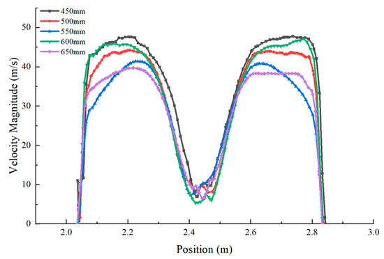 To narrow down the optimal range of suction chamber vertical height (H) and understand its impact on airflow velocity, the range of H obtained from preliminary experiments was divided into five horizontal gradients: 450 mm, 500 mm, 550 mm, 600 mm, and 650 mm. Single-factor experiments were conducted with the straw outlet diameter set at 200 mm, the bottom diameter set at 800 mm, and the negative pressure at the straw outlet set at −2500 Pa. Simultaneously, the corresponding angles (θ) of the suction chamber were set to 56.31°, 59.09°, 61.35°, 63.43°, and 65.26°, respectively. The experimental results were analyzed to determine the optimal range for the vertical height (H) value.