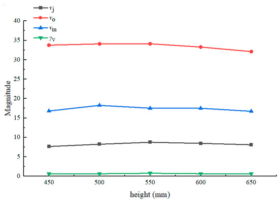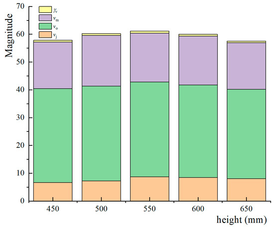 Table 3 summarizes the data and Figure 13 shows the results of various height indicators. It can be observed that as the height (H) increases, the slope (θ) also increases, with an increase of approximately 2° for every 50 mm increase in height. The values of vj, vo, vm, and γv initially increased and then decreased as H increased. The percentage increases for vj, vo, vm, and γv were 7.79%, 6.25%, −3.27%, −4.25%, 0.98%, 0.5%, −2.43%, −3.52%, 8.63%, −3.97%, −1.37%, and −4.49%, respectively. Overall, the change in slope resulted in minimal fluctuations in vo and vm, and moderate fluctuations in vj and γv. Among these indicators, vj, vo, and γv reached their peaks at H = 550 mm, while vm peaked at H = 500 mm. This indicates that excessively large or small slopes results in poor straw transport efficiency. A lower height (H) and smaller slope (θ) caused the airflow to rise more slowly along the chamber wall, leading to more collisions with the wall and a higher collision frequency. Conversely, a higher height (H) and larger slope (θ) resulted in greater energy consumption for airflow transport. Therefore, from the velocity gradient in Figure 10a–e, it can be inferred that H = 600 mm had the smallest velocity peak. The stacked bar chart in Figure 14 shows that the optimal range for suction chamber height was between 500 mm and 600 mm.