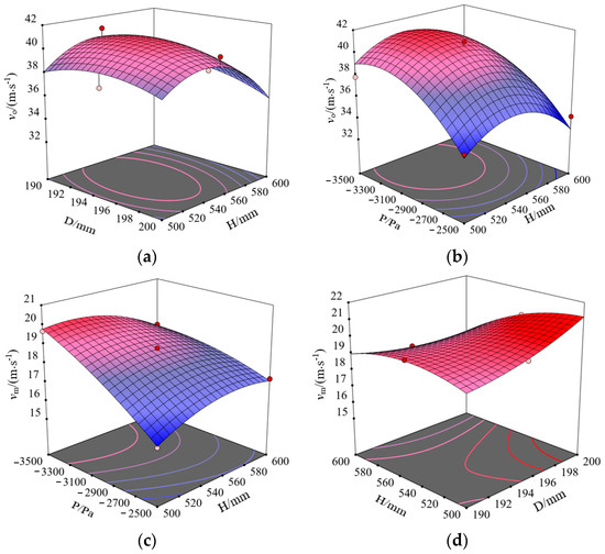 Further analysis of vo and vm related experimental data was conducted to obtain significant interaction response surfaces, as shown in Figure 15, and to analyze them. As illustrated in Figure 15a,d, when the negative pressure was −3500 Pa, the maximum values of vo and vm occurred between H values of 500 and 550 mm, which aligns with the results from the single-factor optimization experiments in Section 2.4.3. As shown in Figure 15b,c, when the straw outlet diameter was 195 mm, both the straw outlet airflow velocity and YZ longitudinal section airflow velocity were positively correlated with the outlet negative pressure. This indicates that vj, vo, and vm are all positively related to the outlet negative pressure, meaning that higher negative pressure is more advantageous for straw transportation. As depicted in Figure 15d, when the negative pressure was −3500 Pa, vm was positively correlated with the straw outlet diameter. The reason for this might be that with a larger straw outlet diameter, there was a greater angle between the straw outlet horizontal plane and the chamber surface, which buffered the collision of the airflow with the chamber surface and helped reduce airflow pressure loss.