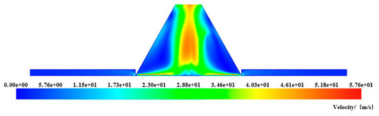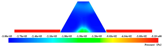 The simulation test results were as follows: vj = 9.238 m/s, vo = 35.71 m/s, vm = 17.79 m/s, γv = 0.61, and as shown in Figure 16, the lowest velocity in the middle region of near-ground airflow was approximately 12 m/s, which met the suspension velocity requirement for straw. Therefore, there was no problem with the straw initiation at the bottom of the optimized suction chamber. As shown in Figure 17, the minimum negative pressure at the bottom of the optimized suction chamber in the green area was approximately −1500 Pa, which was significantly improved compared to the −1360 Pa in Figure 8. As shown in Figure 18, the maximum airflow velocity after optimization was approximately 57.6 m/s, which was greater than the maximum value obtained in the single-factor test shown in Figure 10.