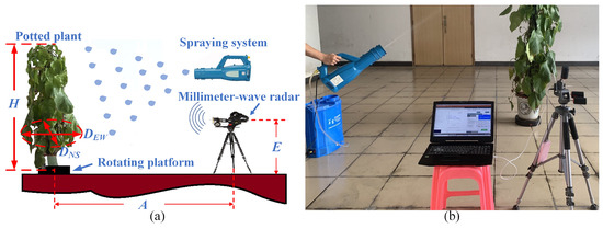 An experimental test system was constructed to appraise the efficacy of millimeter-wave radar in detecting potted plant canopy, as shown in Figure 1. The system is composed of different parts, including a rotating platform, millimeter-wave radar, potted plants (Epipremnum aureum), and spraying system. An individual plant was centrally positioned on the rotation platform. The main part of the spraying system was an electric-driven sprayer which could achieve a flow rate of 1.2 L/min under a pressure of 0.7 MPa. During the experiments, the plant was rotated by adjusting the rotating platform to 1 r/min, at which the spraying system was able to evenly and continuously spray the pesticide onto the plant. All of the experiments were carried out indoors while strictly controlling the environmental conditions in order to ensure the reliability of the results.