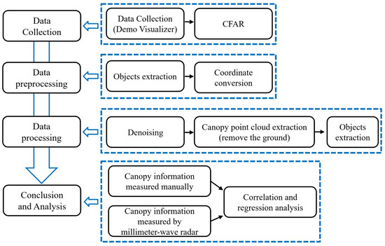 The point cloud data of the potted plants were collected in static, rotating, and rotating-while-spraying (simulating a real working environment) states using millimeter-wave radar, and analysis was performed. However, the point cloud data we acquired unavoidably contained noise, background, and other irrelevant point clouds, resulting in a large amount of inapplicable point cloud data. To mitigate this problem, a preprocessing step to extract the point cloud of the target plant from the raw data was essential in order to reduce the computational cost and improve the reconstruction efficiency. Figure 2 depicts the data processing in three parts: (i) The point cloud data were collected and processed using the Constant False Alarm Rate (CFAR) method to eliminate the noise; (ii) analysis and comparison of the point cloud data of the background and the detection target were undertaken to extract the canopy data; and (iii) Matlab R2017b (MathWorks, Natick, MA, USA) was utilized to reconstruct the canopy of the potted plants while analyzing the canopy information, such as the height, width, and volume of the plants. After this process was complete, the results were compared to the initial measurements in order to determine the detection ability of the millimeter-wave radar.
