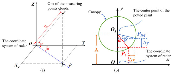 When the rotating platform is stationary, the platform coordinate system coincides with the world coordinate system. In this case, the potted plant data acquired by the radar do not require registration and can be directly used for three-dimensional reconstruction. However, when the potted plant rotates with the rotating platform, different sampling frames need to be correlated and matched to ensure that the point clouds of each sampling frame can be superimposed. Because the z-axis of the rotating platform coordinate system coincides with the z-axis of the world coordinate system, only the data on the X–Y plane need to be calculated, as shown in Figure 3b. A fixed angle difference exists between the x and y values of each frame and the previous frame, which is determined by the speed of motion of the rotating platform and the sampling period of the radar. In order to match the point cloud data of the previous frame to the current moment each point cloud was calculated at the initial angle and canopy radius, starting from the second frame of the data, via the following equation:
