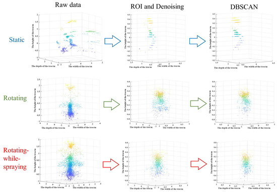 Figure 4 shows the point cloud data processing approach for the potted plants under static, rotating, and rotating-while-spraying conditions. The noise threshold, neighborhood radius epsilon (Eps), and the density threshold were set to 170, 0.05, and 9, respectively, for better processing results. Because the coordinate system is relative to the millimeter-wave radar measurement, the result is a negative z value. The estimated height of the canopy is the sum of the absolute values of the maximum detection distances in the vertical direction (the z-axis).