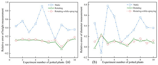 Millimeter-wave radar and manual measurements of ten potted plants were compared to evaluate the error performance in three different states: static, rotating, and rotating-while-spraying. (a) Relative errors for height measurement and (b) relative errors for diameter measurement.