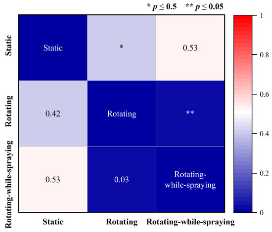 Using a millimeter-wave radar, a cluster of ten potted plants of varying growth stages was gathered under the static, rotating, and rotating-while-spraying conditions. The errors of the millimeter-wave radar relative to the manual measurements under different plant conditions are shown in Figure 5. The relative error was reduced when the plants were measured under rotation due to the increased amount of sampling point cloud data compared to the static condition. The significant correlations between the number of point clouds obtained under different conditions were calculated, and the results are shown in Figure 6. The point density of the plants under the static condition had poor correlation with the rotating and the rotating-while-spraying conditions (p = 0.42 and 0.53), while the number of datapoints recorded under the rotation condition exhibited a strong correlation with the number obtained under the rotating-while-spraying condition (p = 0.03). These results show that the millimeter-wave radar had strong anti-interference performance against fog droplets, making it suitable for dynamic and uncertain agricultural environments.