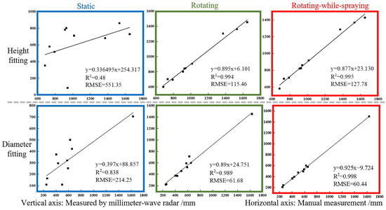 Fitting equations for the measurement results of the potted plants in the three different conditions were constructed, as shown in Figure 7. Compared with manual measurement, the average relative errors for the height and diameter of the potted plants as measured by millimeter-wave radar were 45.15% and 38.07%, respectively, for an average error of 41.61%. On the contrary, the relative errors of the height and diameter in the rotating state were significantly lower at 10.25% and 10.18%, respectively, for an average error of 10.21%. These results indicate that the millimeter-wave radar exhibits superior detection performance for dynamic targets compared to static ones, which can be attributed to two factors. First, the resolution of the millimeter-wave radar was low, resulting in the loss of data on the target edge, particularly when the potted plants were stationary. Second, millimeter-wave radar detection relies on the Doppler effect principle, endowing it with a high Doppler frequency and making for outstanding detection and identification capability for low-vibration targets.