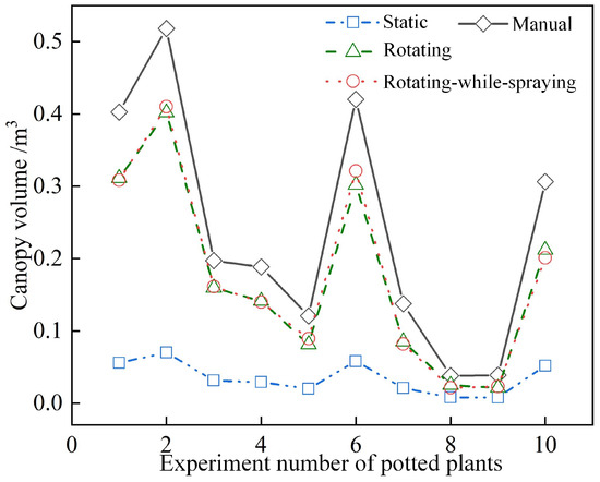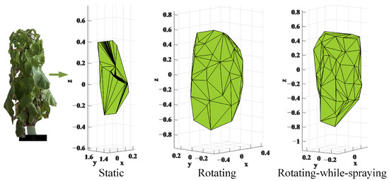 A standardized procedure was applied to investigate the volumes of ten potted plants (Epipremnum aureum) at different stages of growth, revealing that the movement state of the potted plant had a significant impact on the reconstructed canopy volume. The volume of the reconstructed model was considerably smaller than that of the actual potted plant when the latter was stationary, as illustrated in Figure 9. Conversely, the reconstructed structure matched well with the real canopy under the rotating and rotating-while-spraying conditions, with an RMSE of about 0.00813 m3. When the potted plant was static, the millimeter-wave radar only captured the point cloud data of the potted plant from one perspective, resulting in less comprehensive point cloud data in the static state than in the rotating state. Therefore, the volume of the potted plants measured by the millimeter-wave radar tended to be smaller when the plant was in a static position compared to when it was rotating.