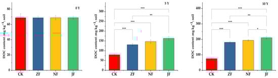 Effects of CK, ZF, NF, and JF on soil dissolved organic carbon (DOC) concentrations in the 0–20 cm soil depth. Each bar represents the mean ± standard deviation in the figure (n = 3). “*” means p < 0.05, “**” means p < 0.01, “***” means p < 0.001.
