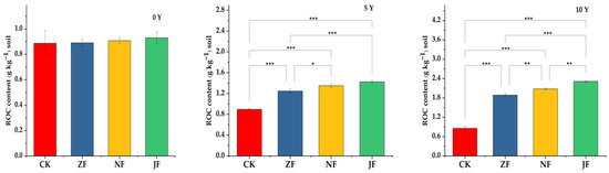 Effects of CK, ZF, NF, and JF on soil readily oxidizable carbon (ROC) concentrations in the 0–20 cm soil depth. “*” means p < 0.05, “**” means p < 0.01, “***” means p < 0.001.
