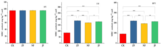 Effects of CK, ZF, NF, and JF on soil microbial biomass carbon (MBC) concentrations in the 0–20 cm soil depth. “*” means p < 0.05, “**” means p < 0.01, “***” means p < 0.001.