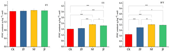 Effects of CK, ZF, NF, and JF on soil particulate organic carbon (POC) concentrations in the 0–20 cm soil depth. “*” means p < 0.05, “**” means p < 0.01, “***” means p < 0.001.