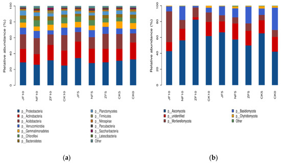 Regarding the bacterial phyla, Proteobacteria (24.9–34.3%), Actinobacteria (13.4–21.3%), Acidobacteria (11.5–20.2%), Verrucomicrobia (5.2–9.4%), and Gemmatimonadetes (5.4–9.0%) were the dominant bacterial phyla in each treatment (Figure 6a). Manure application greatly increased the abundance of Actinobacteria and Proteobacteria in the 5th year and 10th year. Compared with CK, Proteobacteria and Actinobacteria were more abundant under JF in the 5th year and increased greatly under NF and ZF. The Proteobacteria were more abundant under ZF compared to CK and other manure treatments in the 10th year. Concerning the fungal phyla, Ascomycota (42.1–82.4%), Mortierellomycota (6.7–38.6%), Basidiomycota (1.9–28.1%), and Chytridiomycota (0.2–3.0%) were the dominant fungal phyla in each treatment (Figure 6b). Manure application greatly increased the abundance of Ascomycota, Mortierellomycota, and Basidiomycota in the 5th year and 10th year. Compared with CK, Basidiomycota were more abundant under ZF in the 5th year and increased greatly under NF and JF. The Ascomycota were more abundant under ZF, the Mortierellomycota were more abundant under JF, and the Basidiomycota were more abundant under NF.