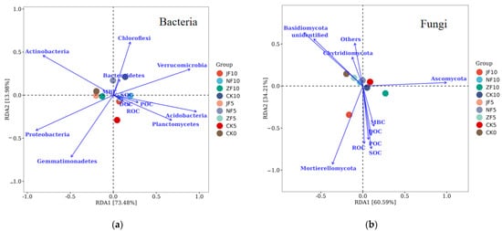 RDA was employed to assess the effects of varying manure applications on soil bacterial populations in relation to soil carbon pools (Figure 7a) and fungal phyla (Figure 7b) under different years. Among the bacterial communities, the dominant phyla-Proteobacteria, were positively correlated with the JF5 and ZF5 treatments and Actinobacteria and negatively correlated with the other two (Acidobacteria and Verrucomicrobia) dominant microbial phyla. Meanwhile, JF10 and NF10 treatments were positively correlated with the Acidobacteria, organic carbon (SOC), dissolved organic carbon (DOC), readily oxidizable carbon (ROC), and particulate organic carbon (POC). Acidobacteria and Planctomycetes were also positively correlated with SOC, DOC, ROC, and POC. In addition, the microbial biomass carbon (MBC) was positively correlated with Actinobacteria, Bacteroidetes, and Chloroflexi. Among the fungal communities, the dominant phyla-Ascomycota and Mortierellomycota were positively correlated with SOC, DOC, ROC, POC, and MBC, while Ascomycota were negatively correlated with Mortierellomycota. Mortierellomycota were positively correlated with JF10; Ascomycota and ZF10 followed the same pattern. Mortierellomycota were positively correlated with JF10, Ascomycota and ZF10 had the same results, and Basidiomycota were positively correlated with NF10. Moreover, Basidiomycota and Chytridiomycota were negatively correlated with SOC, DOC, ROC, POC, and MBC.