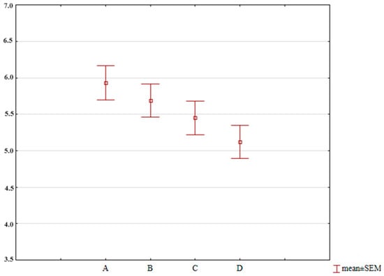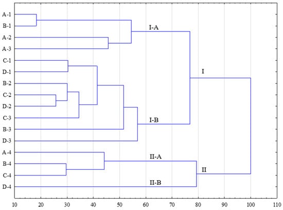 To illustrate the level of similarity between the microbiota profiles determined in different broiler groups, a cluster analysis was also conducted (Figure 1). In this case, the statistical analysis took into account not only the averages but also the distances between the individual data points. As a result of the statistical analysis, two independent groups (I and II) were identified, confirming the influence of yeast supplementation on the quantitative and qualitative structure of the determined microorganisms. This structure varied depending on the yeast content in the feed (A–D) and the fattening stage (1–4). Within the established groups, clusters I-A and I-B, as well as II-A and II-B, were distinguished. Cluster I-A included the control groups, regardless of the fattening stage, in which yeast was not added to the broiler feed (A-1, A-2, and A-3), and group B, which received feed with a 3% yeast additive (B-1). Cluster I-B combined the remaining broiler groups that received Starter feed (groups C and D) and Grower feed (groups B, C, and D) in two fattening stages (1 and 2). Group II grouped microbiological profiles determined in all broiler groups that received Finisher feed, regardless of the yeast content in the feed. Additionally, subgroup II-B was delineated for the broiler group fed with Finisher feed with a 9% yeast additive (D-4).