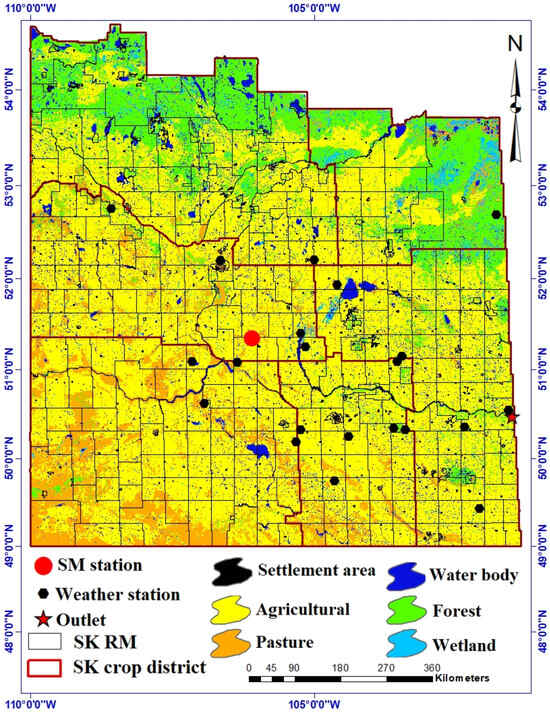Southern Saskatchewan contains approximately 42% of Canada’s cropland, where more than 32,000 farms produce canola and wheat [1]. According to Statistics Canada, wheat and canola production totaled 9.1 and 7.9 million tons, respectively in 2014. This region is the leading Canadian crop exporter with wheat exports of approximately CAD $2.2 million in 2014 [2,3]. However, agricultural production has fluctuated during recent times, primarily owing to the impacts of climate variability that dominate the entire prairie landscape and, in particular, southern Saskatchewan [4,5,6,7,8]. Climate change impacts include reducing soil water content, raising soil temperature, and causing a shift in seasonal variability and extreme weather, including the severity and frequency of droughts and excess water [9,10,11]. Clearly, crop yield simulation as affected by climate change is required to support decision- and policy-making on a regional scale.