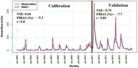 Figure 2 compares the observed and simulated streamflow data. NSE values were 0.66 during calibration and 0.79 during validation, thereby confirming satisfactory results at the monthly time point. Likewise, the corresponding PBIAS values were −5.3% and −7.7% for the two periods, suggesting good performance (PBIAS < ±10%) [7,45,46]. This indicates the model’s ability to properly simulate the stream discharge. Similarly, relatively high r-values (0.8 for both calibration and validation) result in closely matching observed and simulated streamflow data.