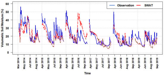 Figure 3 depicts a daily time series of soil moisture measurements from a sensor near Kenaston, SK, and the simulated SWC for the corresponding HRU (no. 918). The SWAT-M performed well for the warm season as indicated by the coefficient of correlation, PBIAS and NSE values of 0.7, 5.3 and 0.46, respectively. Likewise, the agreement of the daily time series confirmed the ability of the SWAT-M to predict SWC.