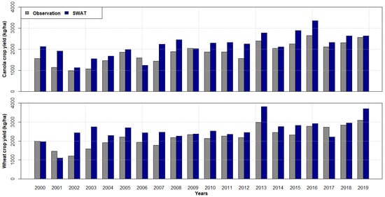 Figure 4 gives the results of calibration (2000–2009) and validation (2010–2019) for the annual yield of canola and wheat. The data for crop yield were collected from 2000 to 2019 at the RM level in bushels/ac unit. To compare with model output, these data were converted to kg/ha.