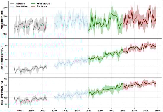 Figure 5 is a time series of the climate variables, showing the precipitation and maximum and minimum temperatures under historical conditions and future RCP8.5 forcing. The ensemble median precipitation was 197 mm in the baseline period, while it increased to 219, 218 and 233 mm during the near, middle, and far future periods, respectively. The ensemble median minimum temperature was −2.75 °C historically, rising to −0.89 °C in the near future, 1.1 °C in the middle future, and 3.3 °C in the far future. The median maximum temperature for the historical simulation was 9.4 °C, and increased to 10.8 °C, 12.4 °C, and 14.2 °C in the three periods, respectively.