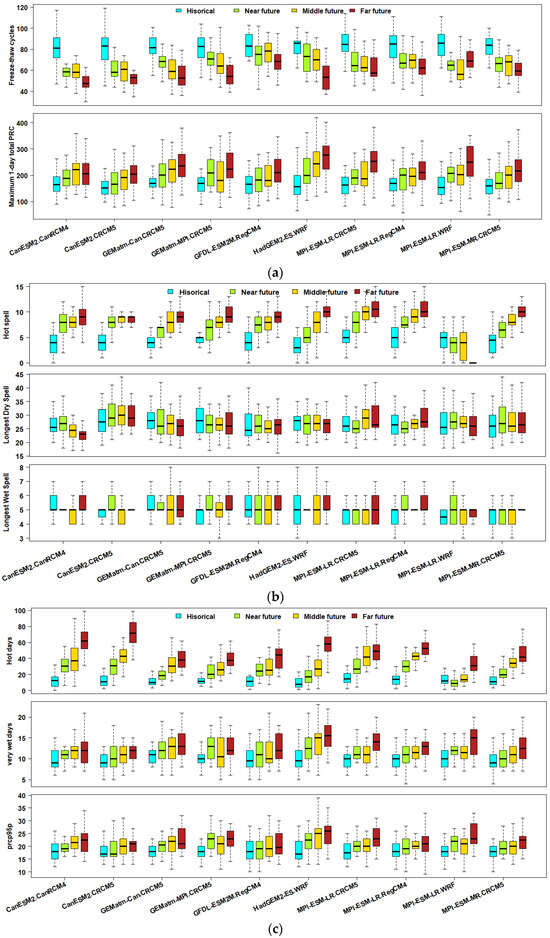 The results of extreme weather indices derived from 10 RCMs are presented as box plots in three categories of intensity, duration, and frequency (Figure 6a–c, respectively). They show that the number of freeze–thaw cycles per year decreases, while the results for the longest dry periods are mixed. The multi-model estimate projects a rise in the number of very wet days, maximum 1-day precipitation (PRC), duration of the longest wet periods, and 95th percentile precipitation index. Although there is no agreement among the RCM models for the temperature indices, the most variation in the projected relative changes was found in the precipitation indices. The results of the freeze–thaw cycles among all RCM models show that HadGEM2-ES.WRF in the historical period was the highest day (86 days), and CanESM2.CanRCM4 in the far future period indicated the lowest day (45 days). The medians of the maximum 1-day total precipitation show that the maximum value was 277mm in the HadGEM2-ES.WRF in the far future and the minimum value occurred at 152 mm in the CanESM2.CRCM5 for the historical period. For the hot spell indices, the higher increase was related to MPI-ESM-LR.CRCM5 with 11 days in the far future and the lower was in HadGEM2-ES.WRF with just 3 days in the historical. The longest dry spell values (30 days) of the future periods were generated by ESM2.CRCM5 for the middle future, while the longest wet spell was almost the same among all models and periods. The results of the indices for very wet days (95th percentile precipitation) show that HadGEM2-ES.WRF in the far future had the highest amount (16 and 26 days, respectively), and CanESM2.CRCM5 in the historical period indicated the lowest amount (9 and 17 days, respectively). The hot days data reveals that CanESM2.CRCM5 was the highest day (72 days) in the far future and that HadGEM2-ES.WRF was the lowest (8 days) in the historical period.
