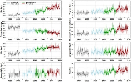 Figure 7 gives the temporal evolution of annual weather extreme indices under RCP8.5. These time series show an increasing trend for all indices, however, the temperature-related indices indicate a more pronounced upward trend compared to the rainfall-related indices. For instance, the hot days and hot spells indices are 11 and 4 days historically, while these values increase to 46 and 11 days in the late century, respectively.