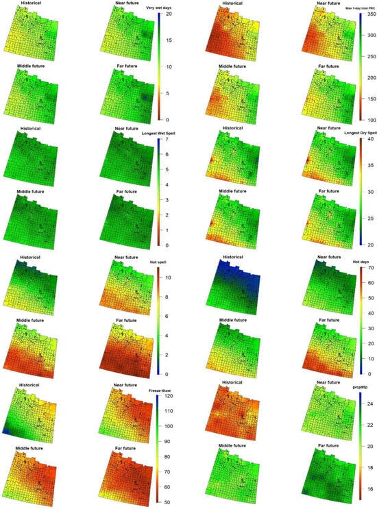 The spatial maps of multi-model median in the historical and projected climate using the CMIP5 models over the three periods for eight weather indices.