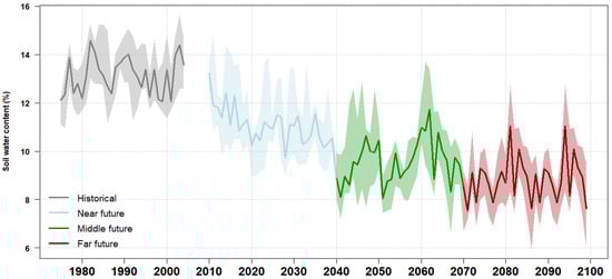 Soil water content in historical and projected periods. Solid lines are ensemble medians and shadings show the interquartile ensemble spread (25th and 75th quantiles).