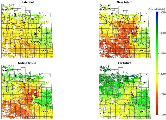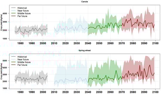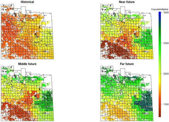 Eight weather extreme indices were analyzed in terms of their temporal and spatial variability and their correlation with crop yield in southern Saskatchewan. The multi-model ensemble showed an increasing radiative forcing over time of temperature and precipitation indices, similar to the findings of previous studies using climate models [53,54,55,56]. The RCMs project warmer and wetter conditions relative to a historical baseline. The greatest warming is found over the south and southwest of Saskatchewan and the largest increase in precipitation indices is in the north and northeast. Warmer temperatures will be beneficial for agriculture because they will be accompanied by longer frost-free seasons and more growing degree days [57]. The results for canola and wheat indicate an increase of 17 and 9.7% in the near future, 28.2 and 15.6% in the middle future, and 44.7 and 32% in the far future, respectively, under rain-fed conditions. These results are comparable to modeling crop yield at specific sites in the region. Smith et al. [58] estimated an increase of 37% for spring wheat using the DNDC model in the Canadian Prairies for 2050. Qian et al. [5] found an increase of 26 to 37% during 2041–2070 compared with the baseline period of 1971–2000 using the DSSAT model. Using CanRCM4 climate data and the DSSAT model, He et al. (2018) also determined that spring wheat yield will increase by 15%. Our research, extending across southern Saskatchewan, indicated that despite an overall increase in median annual wheat and canola yield, the crop yield in the extreme south and southwest regions shows a significant decrease, reaching around 1000 for the near and middle future.
