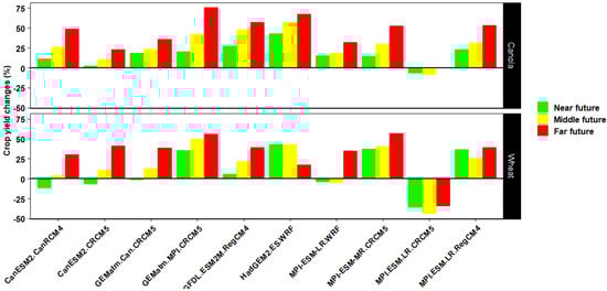 Figure 10 gives the temporal evolution of annual crop yield under RCP8.5. The median values for an ensemble of 10 RCMs show an increasing trend towards the end of the current century. The historical median yields of canola and wheat were 1971 and 2360 Kg/ha, respectively. Canola increased by 2200, 2454, and 2771 Kg/ha during the near, middle, and far future, respectively. In contrast, wheat exhibits a different trend, with a decline of 2115 Kg/ha during the near future, followed by an increase to 2465 and 3047 Kg/ha in the middle and far future periods, respectively. Compared to the historical period, canola and wheat show an increase of 17 and 9.7% in the near future, 28.2 and 15.6% in the middle future, and 44.7 and 32% in the far future, respectively. However, under one RCM, MPI.ESM.LR.CRCM5, the yields decline by −6.86 to −0.48% for canola and −36.45 to −44.47 for spring wheat (Figure 11). Both canola and spring wheat yields increase across all other RCM models in the far future, except MPI.ESM.LR.CRCM5.