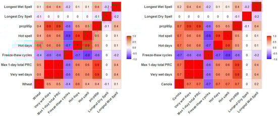 Figure 14 is a heat map of the Pearson correlation coefficients across all extreme weather indices and crop yield for the historical and projected periods. Canola yield has a high correlation with almost all weather indices except longest dry and wet spells, while spring wheat has a strong correlation with just hot spells. Several pairs of extreme indices had a strong positive or negative linear relationship; very wet days and maximum 1-day total precipitation show the strongest positive correlation.